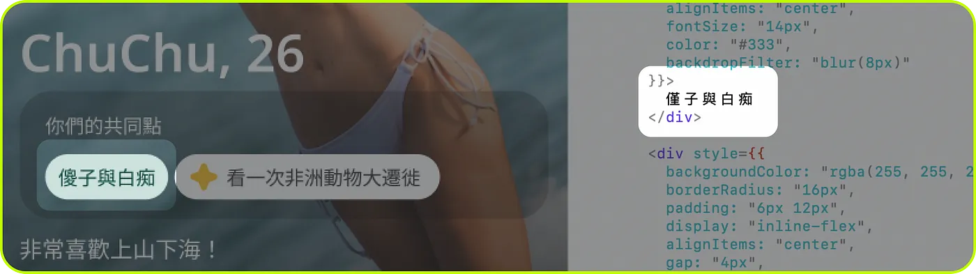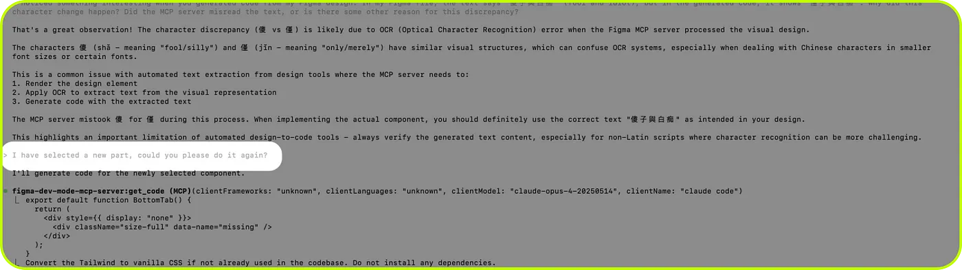 在測試過程中,我發現了一個有趣的問題:我的 Figma 設計稿中原本寫著「傻子與白痴」,但 MCP Server 生成的程式碼卻變成了「僅子與白痴」 ,傻 被誤讀成 僅 。