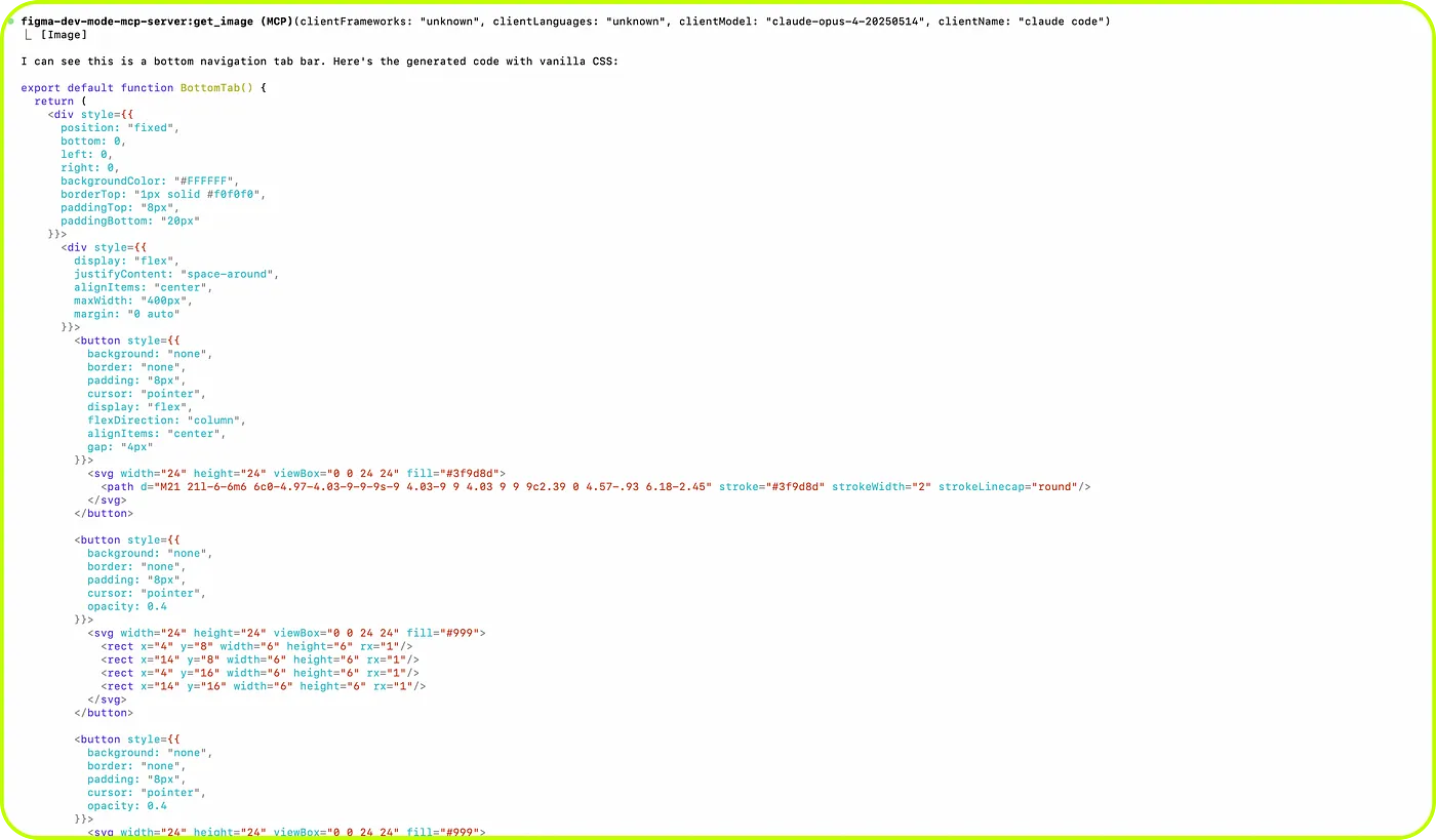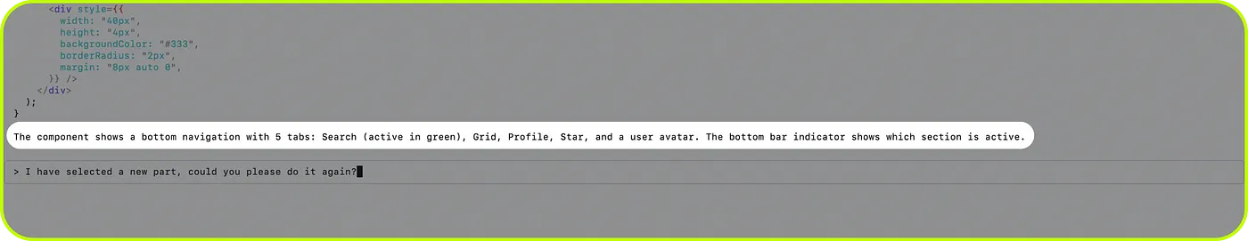 從這張畫面可以發現,MCP 成功讓 AI 讀懂了選中的元件是一個有 5 個 tab 的 bottom navigation,以及有哪些 tab。