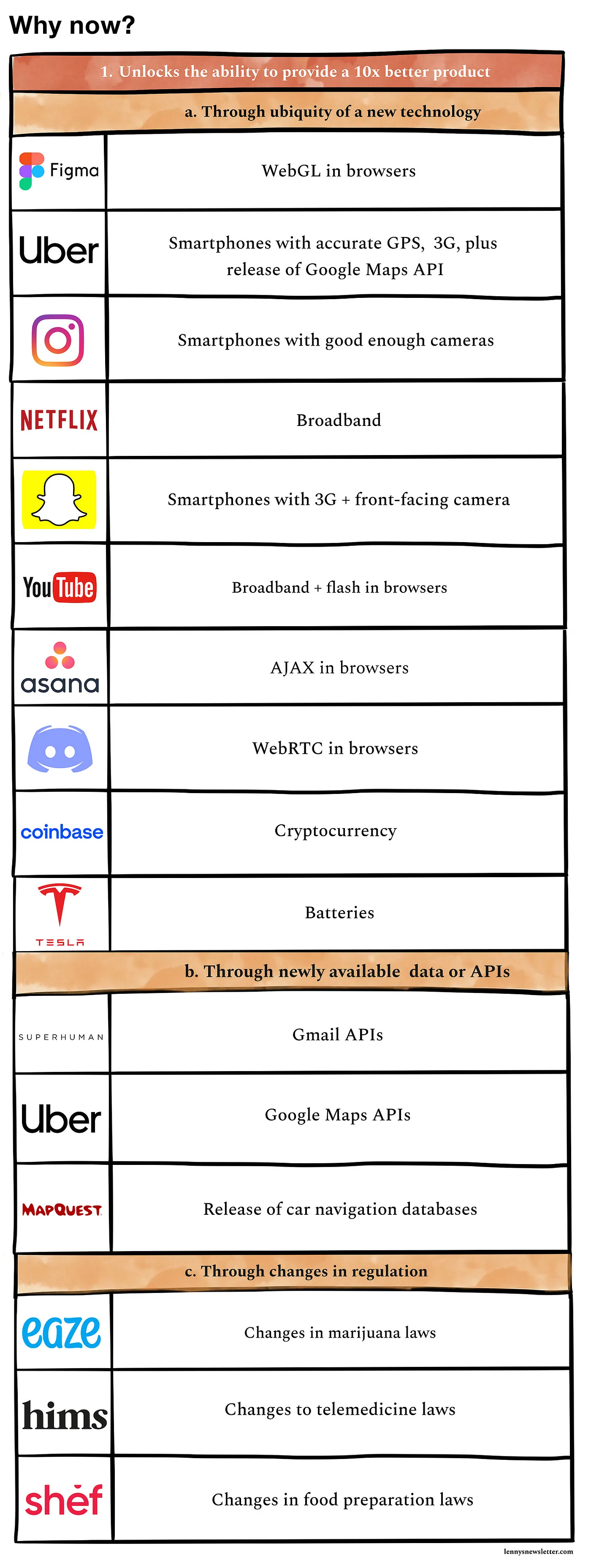 關於第一個子問題「關鍵啟動條件為何?」不同商業模式與產品服務有著不同的「關鍵啟動條件」。Lenny’s Newsletter 在他的文章《Why now?》整理了三種常見的關鍵啟動條件: