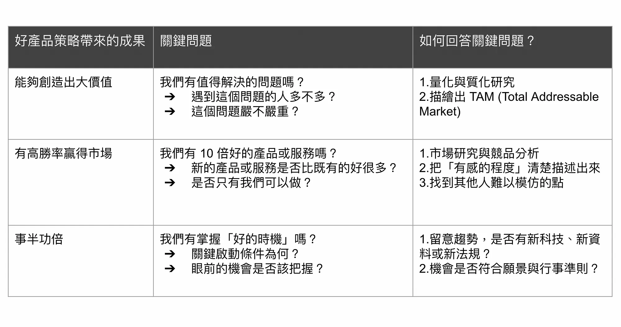而從這三個點,我們可以延伸出思考好產品策略的關鍵問題。