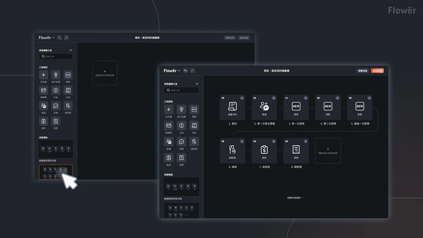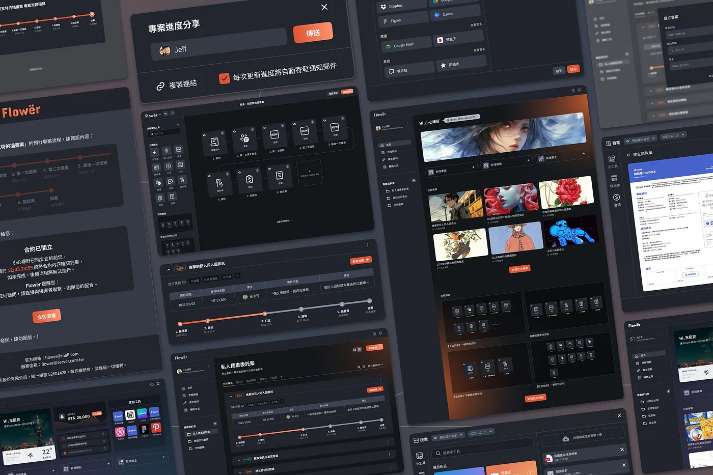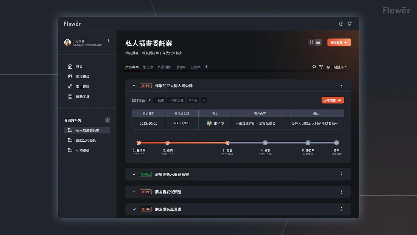 專案流程視覺化,收合選單設計各專案進度可快速瀏覽,狀態一目瞭然,輕鬆掌握手邊專案。捨去市面專案管理軟體的介面複雜、學習成本高,Flöwer 以功能簡單、畫面資訊清楚易懂為主旨,更符合接案者的使用情境。