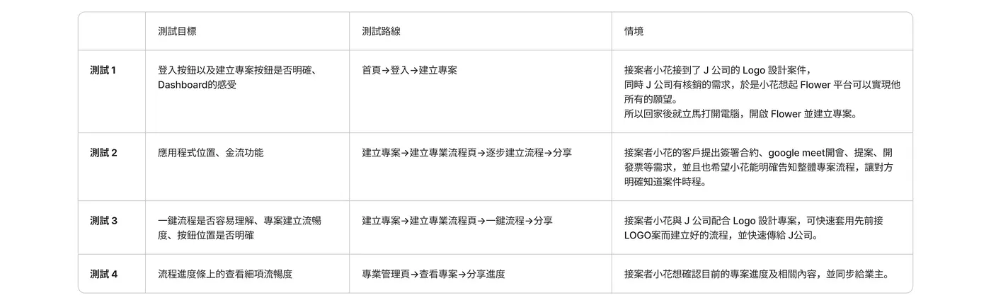 為了驗證想法可行性,我們完成初步的 Mockup 並製作 Prototype,在緊迫的時間內火速尋找接案的朋友進行測試。總共擬定了四個測試目標與路線,分別請四位受測者在每個項目中用放聲思考法將感受及想法表達出來,再依據回饋內容的重要度判斷優化的優先順序。