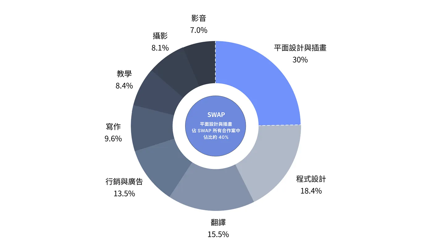 考慮到 SWAP 是規模比較小的公司,必須鎖定利基市場、專注在一個族群,才能集中資源快速驗證。所以我們先從市場規模來分析,發現台灣的接案市場和 SWAP 用戶中,專業類別佔最大的都是平面設計和插畫,這代表著有一定的潛在用戶,所以我們決定先從這個族群切入探索。