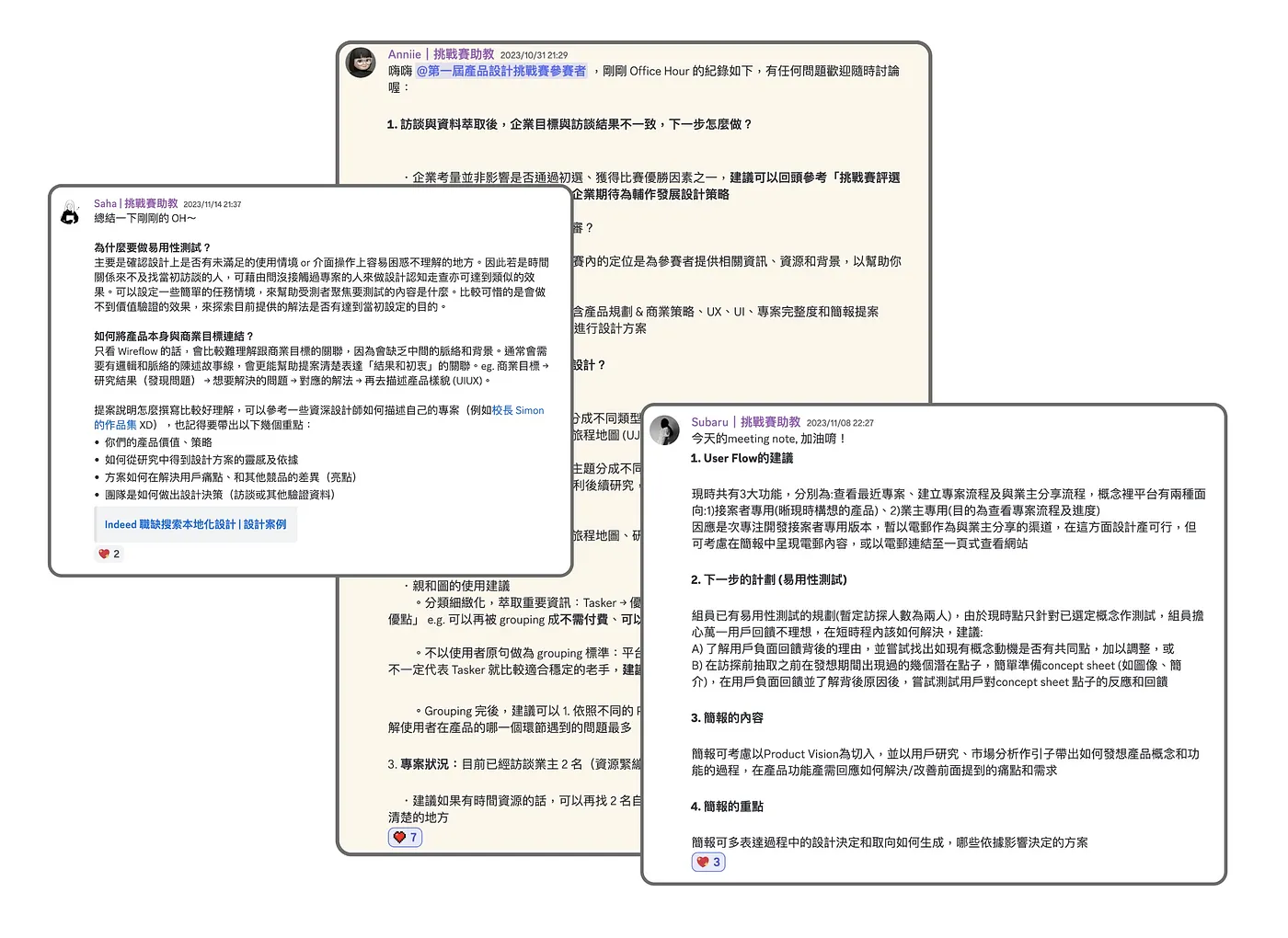 我們是依據當前的產品設計階段遇到什麼樣的瓶頸,再根據助教小卡上面的資訊尋找擅長的助教。在這段期間內,我們總共配合過 4 位助教,能感受到每位助教都用心解答我們的疑問,給出的建議總是能幫助我們思路更加清晰,並且釐清產品的可行性與方向。Office Hour 結束後,助教還會貼心地將回饋內容整理成文字重點給我們,超級暖心!