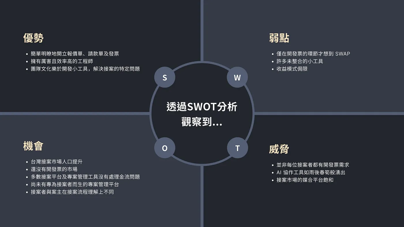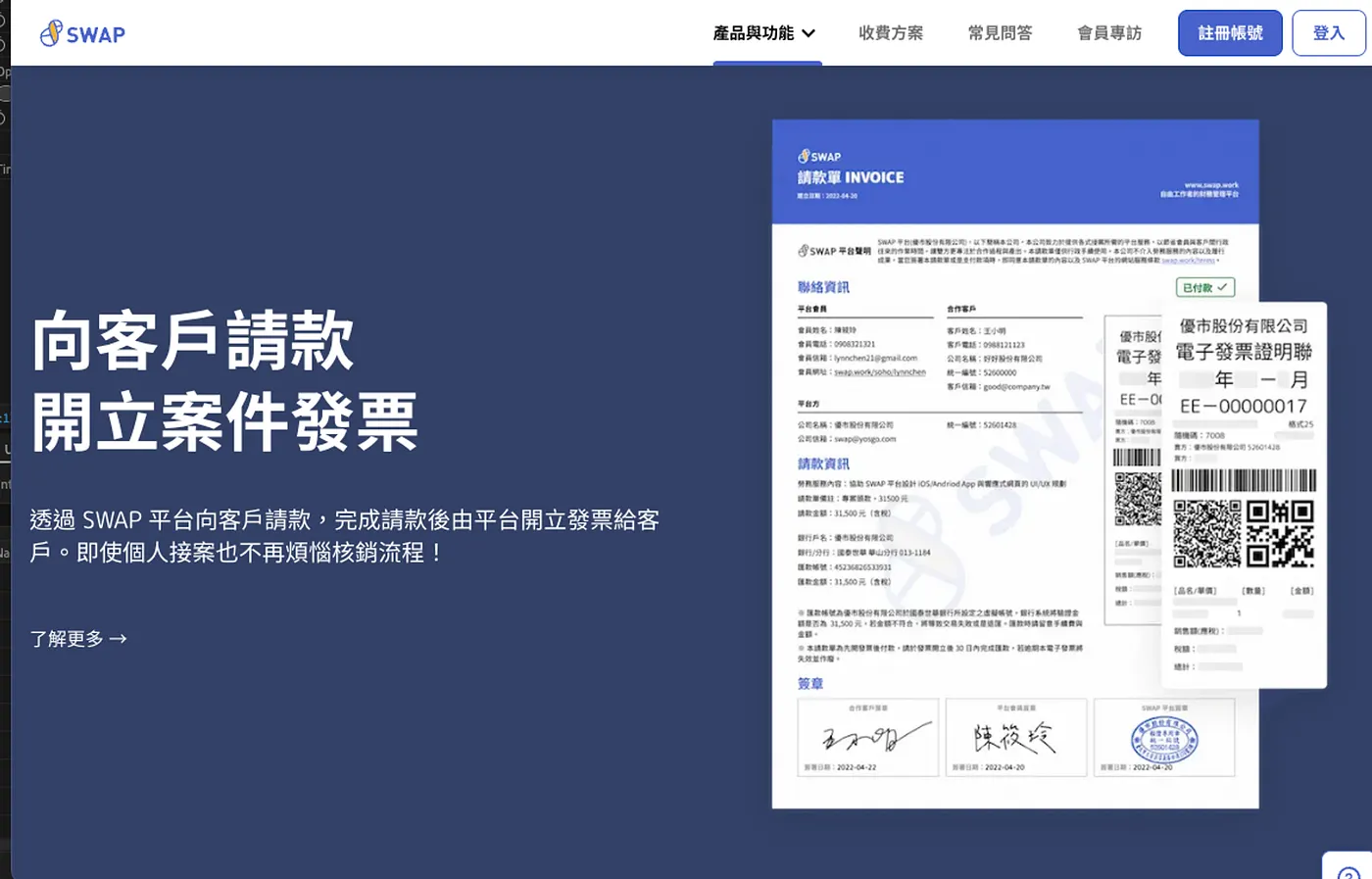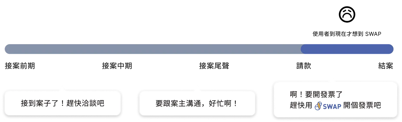 雖然是最亮眼的功能「開立報價單、請款單及發票」,然而接案者只在請款跟結案才會接觸到 SWAP,甚至也不是接案時必要需求,產生「使用者接觸產品的時機有限,導致收益侷限」🥲