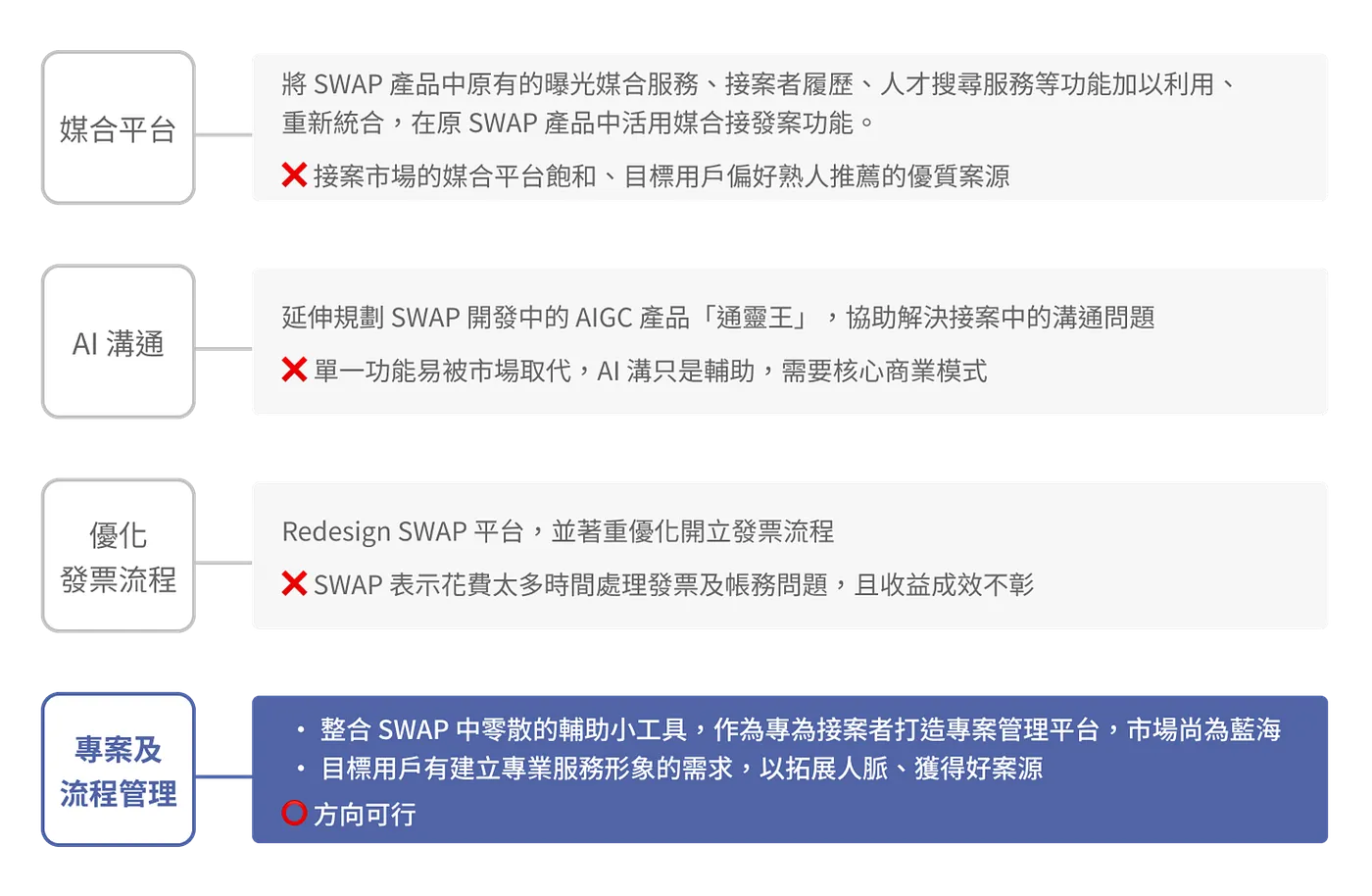 作為解決自由工作者接案痛點的平台,我們決定聚焦在特定族群,只專注於接案者最重要的輔具工具。這樣做不僅可以避免增加使用上的複雜度,還能幫助 SWAP 用最少的開發時間,快速投入熟悉的接案市場進行驗證。