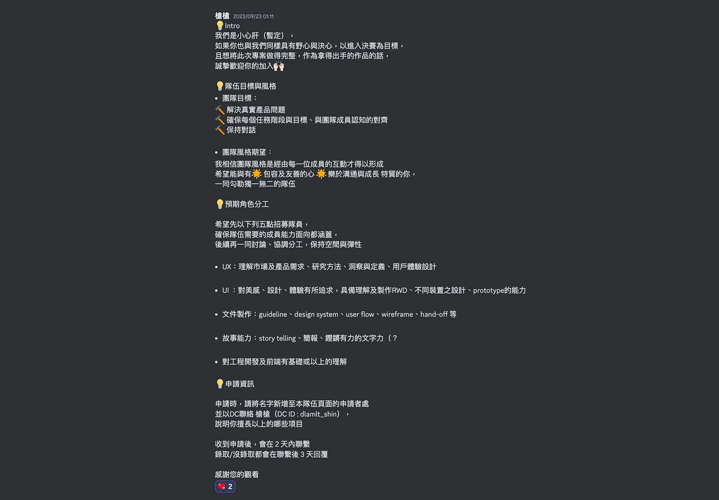 其中也包含「想要解決企業真實問題」為出發點進行產品設計及優化,畢竟很少有真實的企業願意提供產品及現階段所遇到的問題讓我們進行產品設計,機會如此難得當然必須得把握!所以在招募文案中下了些苦心,希望能招到相同目標的成員。