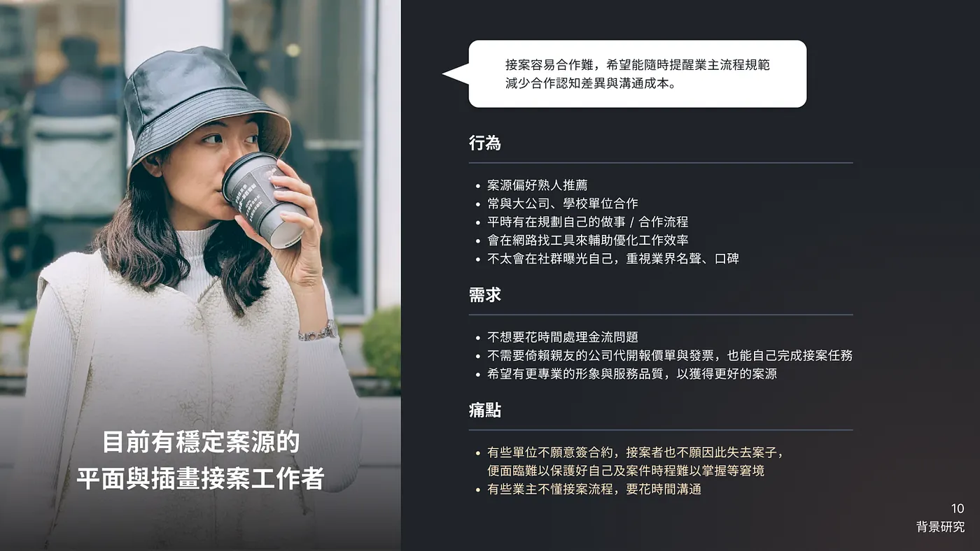 目標客群感受到的原因:自由工作者與業主的資訊不對稱、自由工作者市場競爭激烈⋯⋯等。