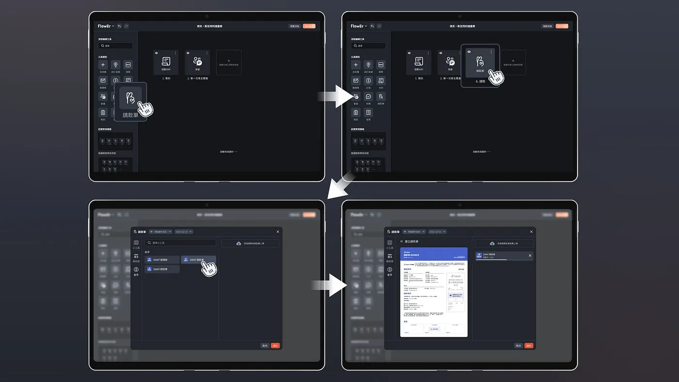 將 SWAP 的開立報價單、請款單及發票功能作為小工具,串接在流程建立中。 引導在專案流程中有請款需求的 Flöwer 用戶使用此工具,為 SWAP 建立用戶池。