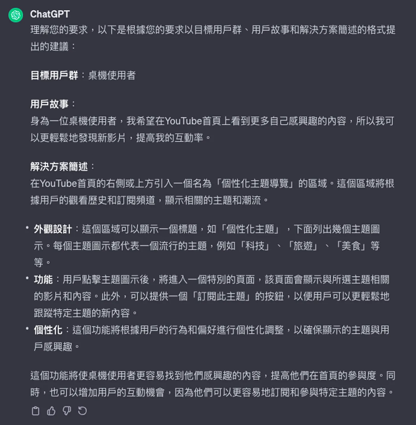 可以發現校正之後,ChatGPT 的回覆更加地精確並且可操作,不只是寬泛的設計原則,而是聚焦在新功能與設計邏輯上。