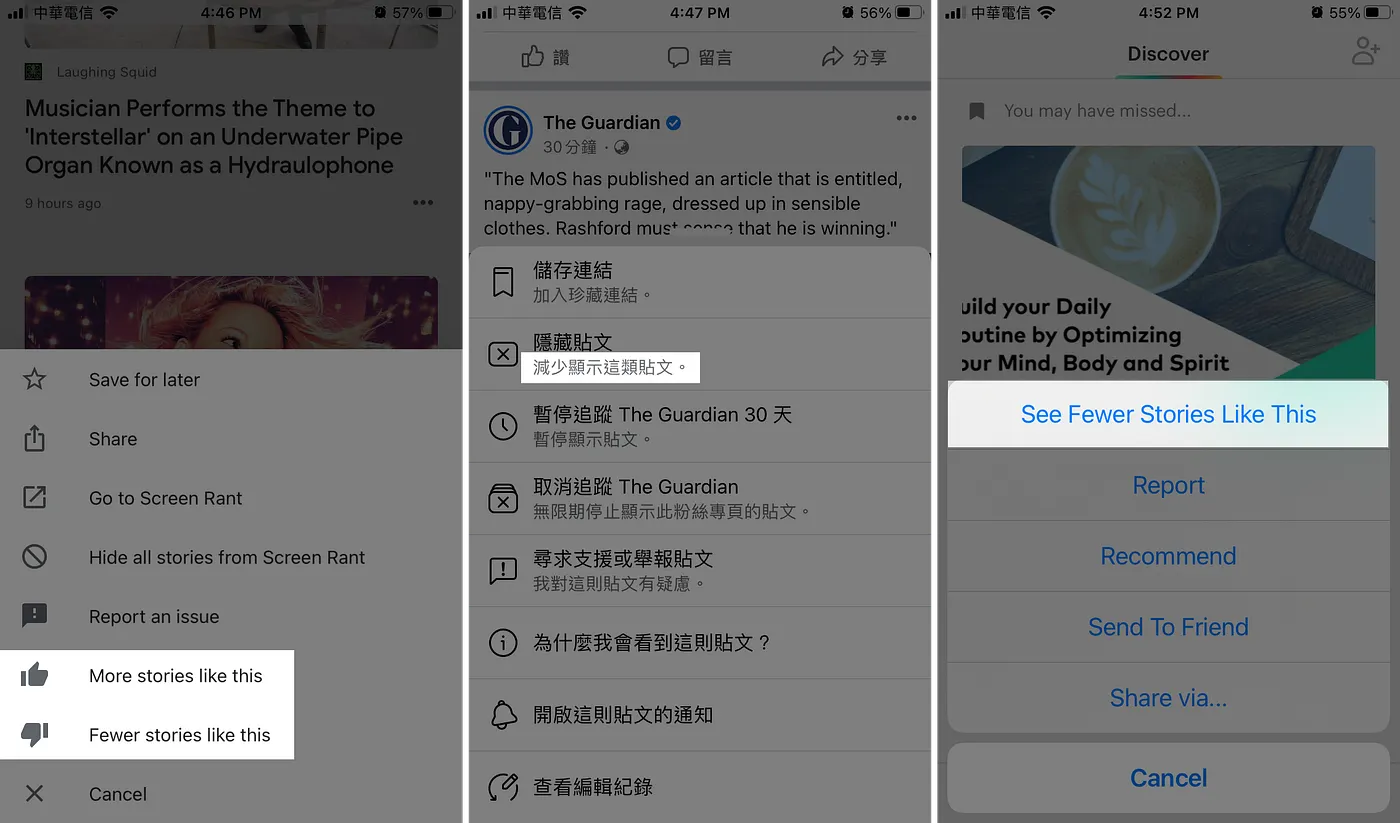 讓使用者選擇「減少顯示這類貼文」的選項按鈕