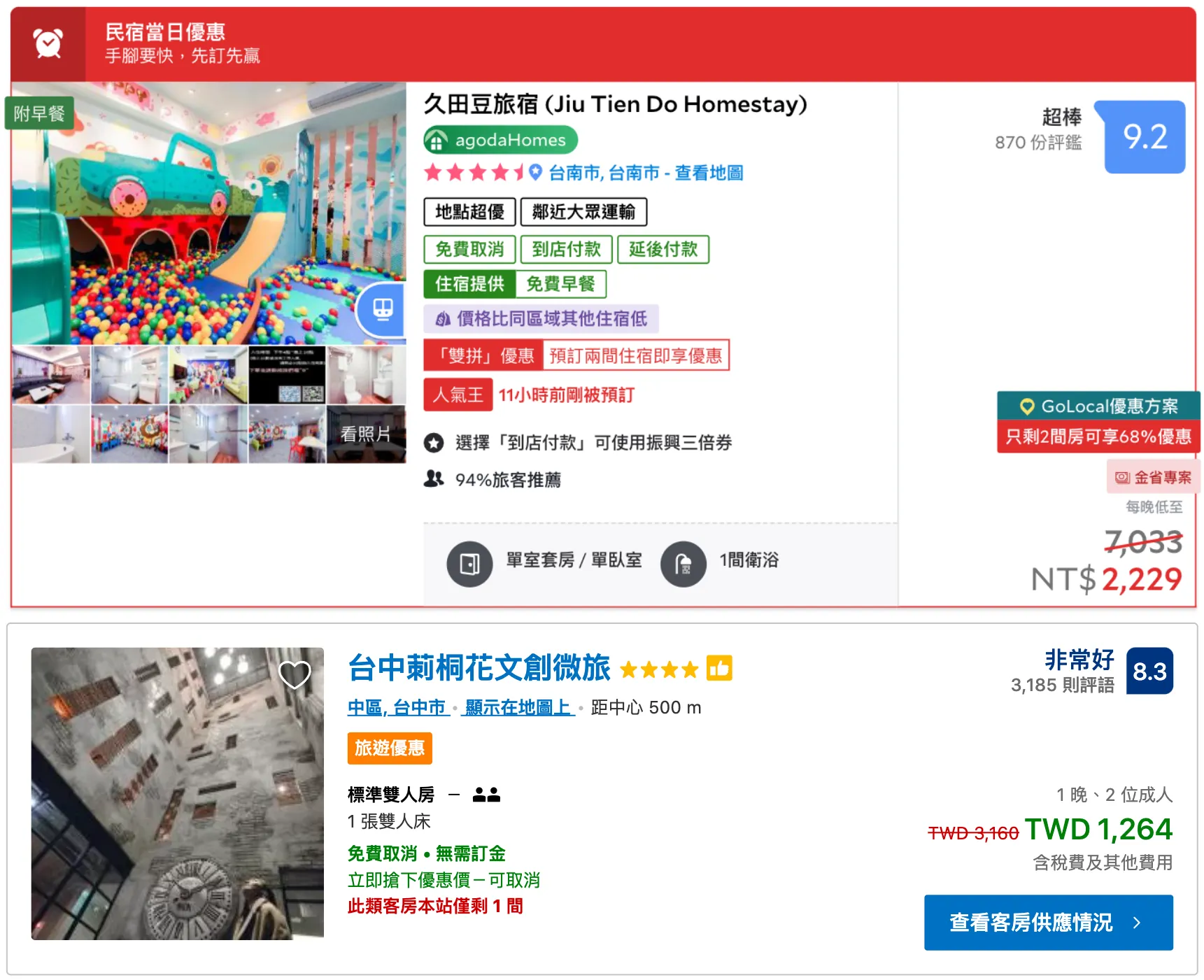 以 Agoda V.S. Booking.com 為例,可以感覺得出來 Agoda(上)的介面比 Booking.com(下)來得更有壓迫感一些: