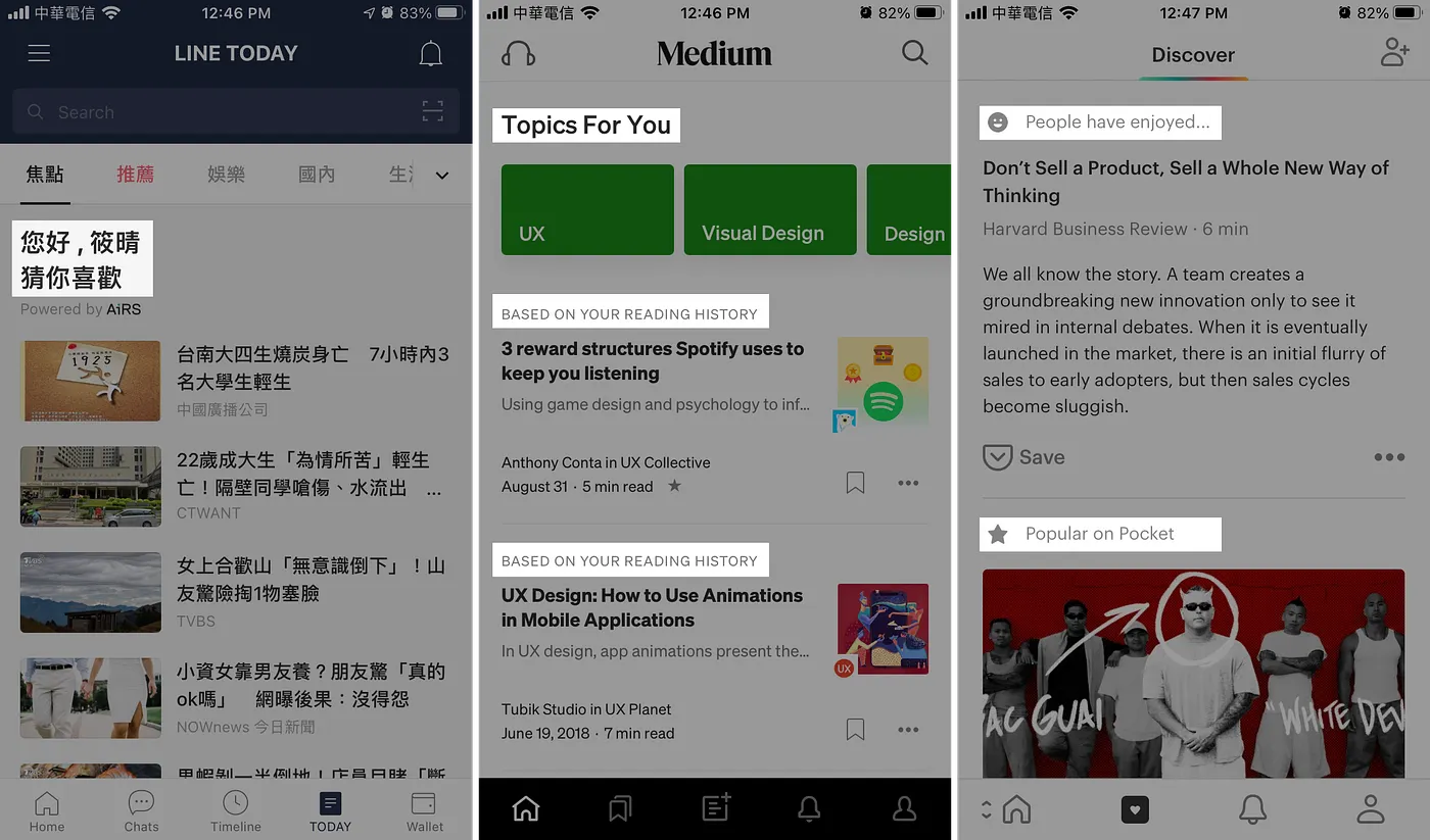 註:上圖為 Google News、Facebook 和 Pocket 的範例,在此做示意用,並不代表這三個產品的這些按鈕實際上真的沒有任何功用。