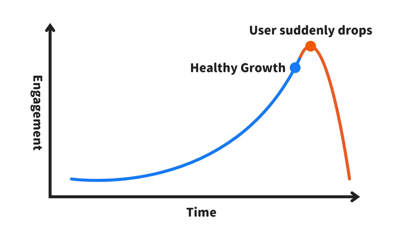在設計一個產品時,我們經常會期望能夠提升使用者打開 app 的頻率,或是增加每次開啟後使用的時間長度。但是當使用頻率、時間或是強度(例如在產品上所花費的金錢)達到頂點後,人們會瞬間地感到厭倦,就像是壓死駱駝的最後一根稻草一般,最後選擇放棄。