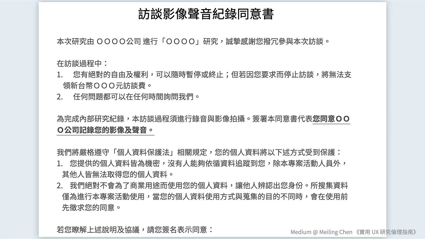以目前正在顧問公司工作的筆者來說,我們研究團隊在正式訪談時,一定會給受訪者簽署同意書,上面大致會包含以下項目:
