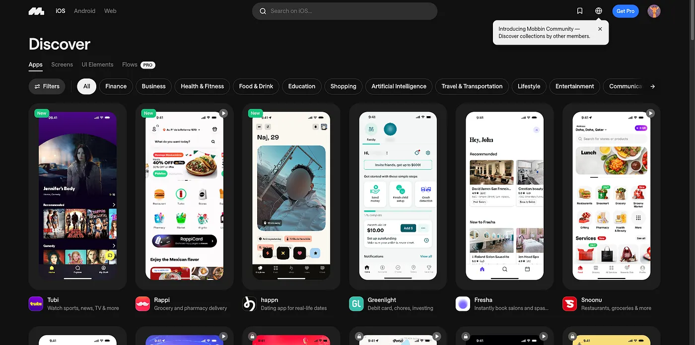 在做競品研究的時候,除了直接使用參考對象的產品,我有時候也會用 Mobbin Design 這類的工具。Mobbin 是一個替設計師擷取 APP、網站介面的服務,它會把常見的 APP 截圖按照用戶流程分類,讓你可以依照產品類別、用戶流程等等查找,對競品調查很有幫助。
